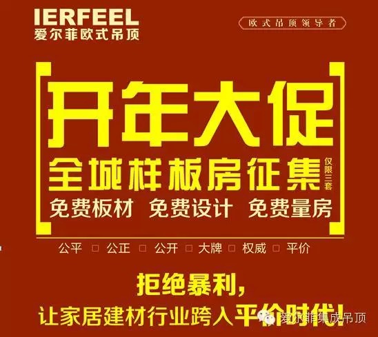 在3.15即將來臨之際,集成吊頂十大品牌愛爾菲歐式吊頂——歐式吊頂品牌領(lǐng)導(dǎo)者,為助力消費者過實惠舒心的3.15,享誠信購物之喜,特別開啟了新年首輪“開年大促 全城樣板房征集(僅限三...