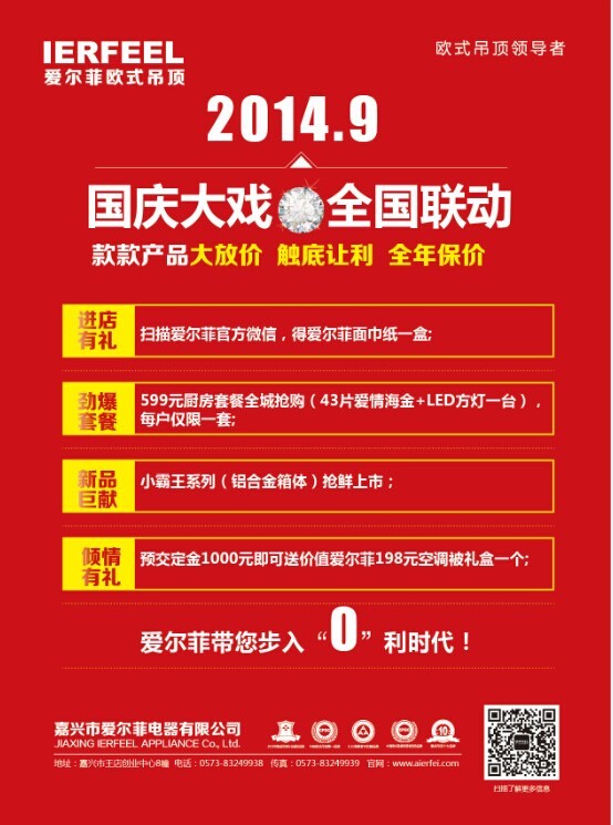 金九銀十,秋高氣爽的天氣也是一年中裝修的旺季,每年的這個(gè)時(shí)候,在家居建材行業(yè)都將會(huì)掀起一輪搶購(gòu)熱潮。為了回饋廣大消費(fèi)者對(duì)愛(ài)爾菲歐式吊頂一直以來(lái)的支持與厚愛(ài),在中秋即將來(lái)臨之時(shí)至十一國(guó)慶黃金財(cái)期間,愛(ài)爾菲將推出“全國(guó)聯(lián)動(dòng),比半價(jià)還低10%”大型促銷盛會(huì),優(yōu)惠力度空前,促銷陣容超強(qiáng),對(duì)于有計(jì)劃秋季裝修的全國(guó)業(yè)主們來(lái)說(shuō),無(wú)疑是一場(chǎng)不可錯(cuò)過(guò)的選購(gòu)良機(jī)。