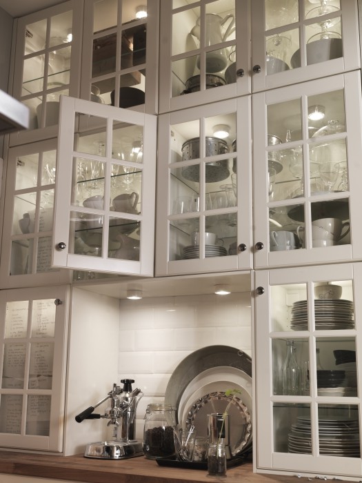 廚房的儲物區(qū)可以安裝射燈,方便看清內(nèi)置物品,而這些燈光和玻璃剔透的光澤互映,帶來愉悅的感覺。