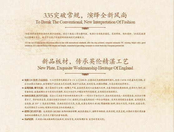 愛爾菲歐式吊頂335系列采用符合國際標(biāo)準(zhǔn)的優(yōu)質(zhì)合金鋁板,經(jīng)過十?dāng)?shù)道工序打磨而成,電腦全自動數(shù)控著色,色彩明艷,飽和度好。335花色造型以淡雅質(zhì)樸為主,致力于為客戶打造清新別致的歐式田園生活。
