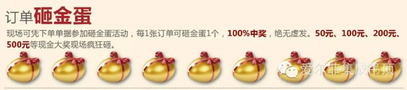 現(xiàn)場(chǎng)可憑下單單據(jù)參加砸金蛋活動(dòng),每1張訂單可砸金蛋1個(gè),100%中獎(jiǎng),絕無(wú)虛發(fā)。50元、100元、200元、500元等現(xiàn)金大獎(jiǎng)現(xiàn)場(chǎng)瘋狂砸。