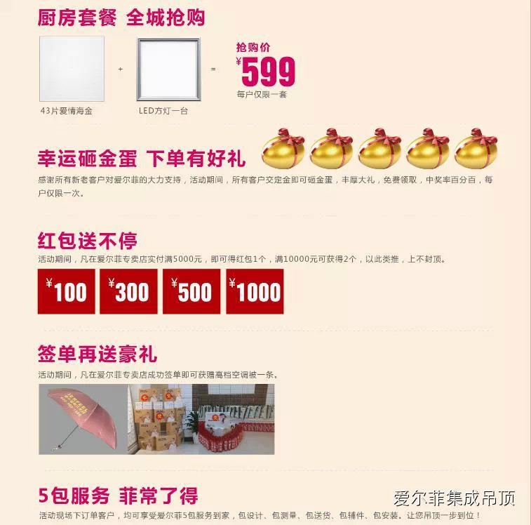 活動現(xiàn)場下訂單客戶,均可享受愛爾菲5包服務(wù)到家,包設(shè)計、包測量、包送貨、包輔件、包安裝,讓您吊頂一步到位!