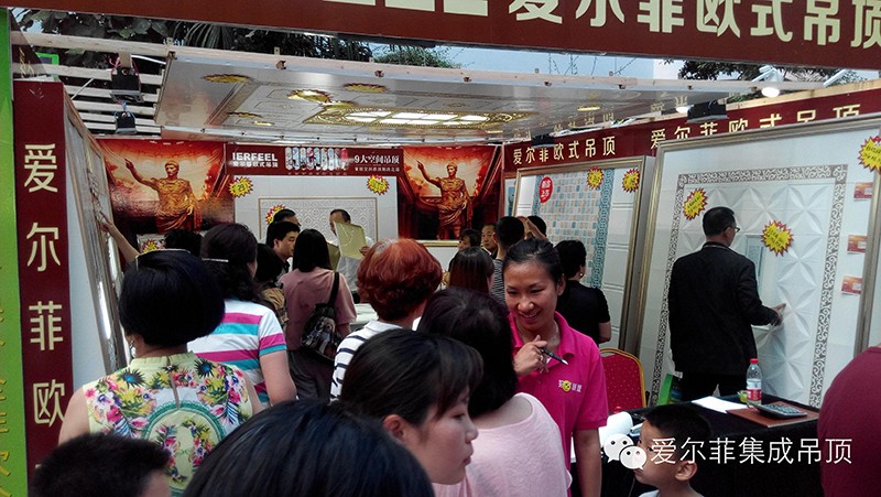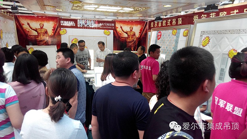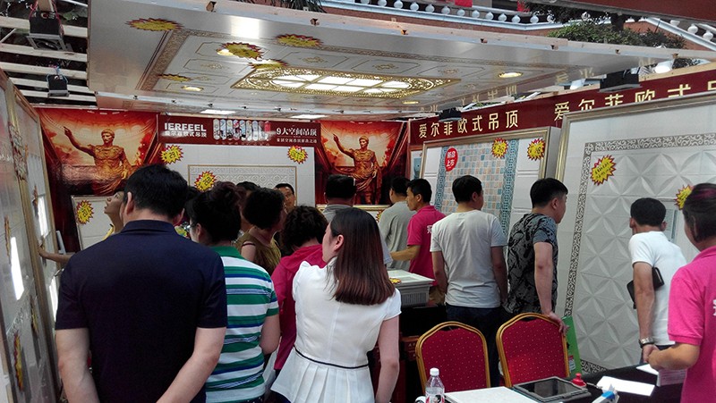 引人矚目的愛爾菲歐式吊頂宣傳廣告矗立在道路兩側,展位里一件件如藝術般的吊頂展示品和數(shù)十套歐式經(jīng)典套餐組合吸引無數(shù)過往消費者駐足觀望,微信掃一掃領禮品,下單抽獎等誘惑環(huán)節(jié),令展位里被前來咨詢下單的消費者圍堵的水泄不通,產(chǎn)品風格介紹、產(chǎn)品功能體驗等讓每一位導購人員都忙的不亦樂乎!