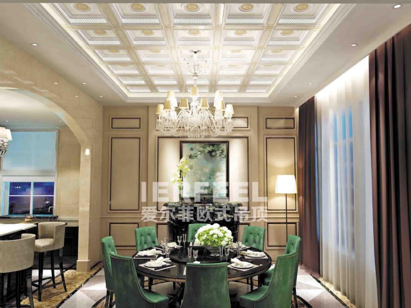 餐廳雖然是居家生活中比較小的空間區(qū)域,但是餐廳是一家人飲食的地方,具有家庭中其他空間不可替代的價(jià)值,所以餐廳吊頂裝修也是不容忽視的。今天,小編就帶大家來(lái)欣賞由愛(ài)爾菲歐式吊頂搭配設(shè)計(jì)的餐廳裝修效果圖。