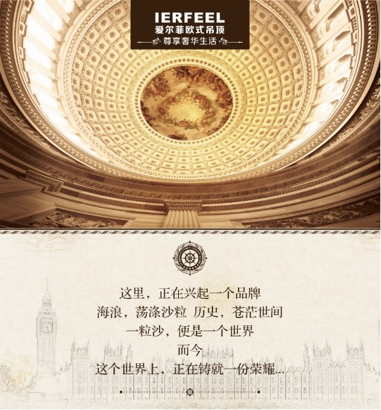 據(jù)悉,有著歐式經(jīng)典風(fēng)格痕跡的新古典主義理念,在愛爾菲歐式吊頂2015新品“英倫詩(shī)話系列”及“歐陸經(jīng)典系列”就表現(xiàn)的淋漓盡致。在宮廷氣息的整體設(shè)計(jì)中融入了歐式的華麗和古典等元素,強(qiáng)調(diào)建筑與自然、人與自然的有機(jī)結(jié)合。整體效果奢華而不張揚(yáng),高雅而不媚俗,讓消費(fèi)者不出國(guó)門也能體驗(yàn)到異國(guó)風(fēng)情,不到法國(guó)也能領(lǐng)略古堡中的貴族生活。