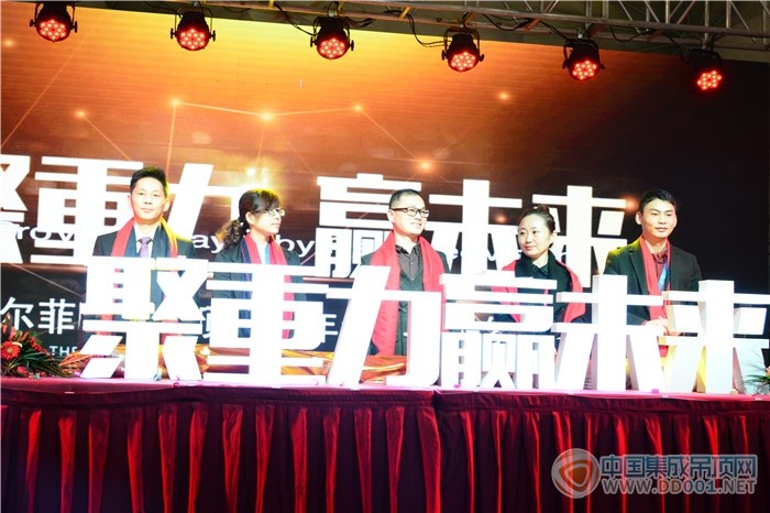 暖場活動之后,主持人宣讀會場規(guī)則,致歡迎辭!在主持人的介紹下,愛爾菲總經(jīng)理董海飛、常務(wù)副總宋高峰、營銷總監(jiān)周衛(wèi)國、市場部經(jīng)理俞敏莉和全年銷售冠軍長春經(jīng)銷商吳冬梅一起上臺為本次主題年會揭幕。全場家人自發(fā)全體起立,有節(jié)奏的鼓掌聲,吶喊聲,倒數(shù)計(jì)時(shí)聲響徹會場上空。隨著倒數(shù)計(jì)時(shí)結(jié)束,禮花齊放,幾位領(lǐng)導(dǎo)一起拉下幕布,“聚重力·贏未來“六個大字被點(diǎn)亮,全場掌聲,吶喊聲不斷,氣氛熱烈。